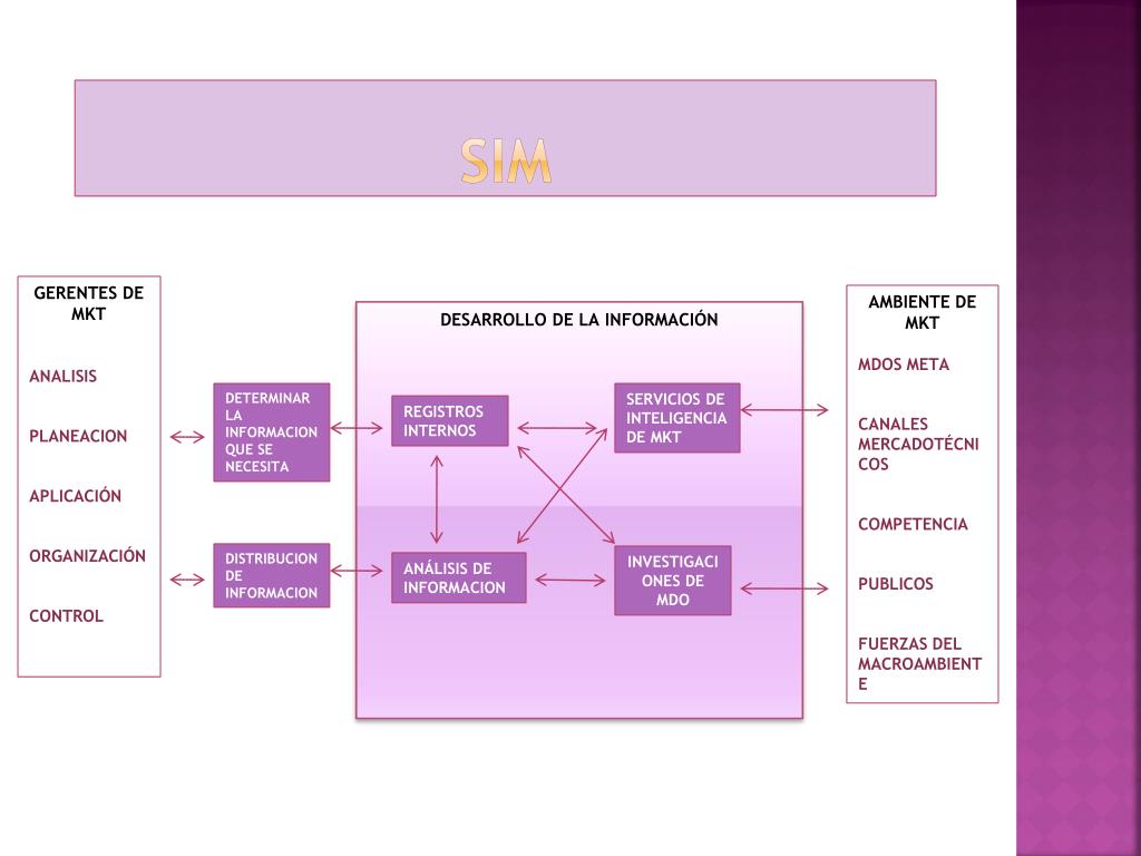 SIM GERENTES DE MKT ANALISIS PLANEACION APLICACIÓN ORGANIZACIÓN CONTROL AMBIENTE DE MKT MDOS META CANALES MERCADOTÉCNICOS COMPETENCIA PUBLICOS FUERZAS DEL MACROAMBIENTE DESARROLLO DE LA INFORMACIÓN DETERMINAR LA INFORMACION QUE SE NECESITA SERVICIOS DE INTELIGENCIA DE MKT REGISTROS INTERNOS DISTRIBUCION DE INFORMACION INVESTIGACIONES DE MDO ANÁLISIS DE INFORMACION