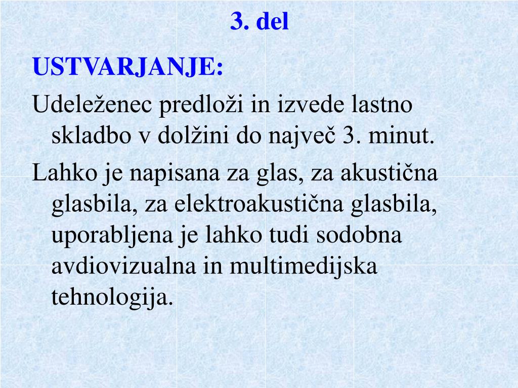 3. del USTVARJANJE: Udeleženec predloži in izvede lastno skladbo v dolžini do največ 3. minut. Lahko je napisana za glas, za akustična glasbila, za elektroakustična glasbila, uporabljena je lahko tudi sodobna avdiovizualna in multimedijska tehnologija.