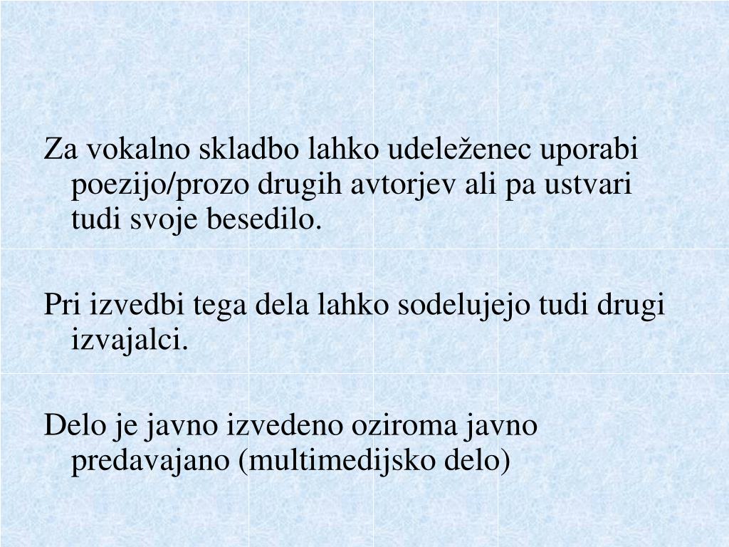 Za vokalno skladbo lahko udeleženec uporabi poezijo/prozo drugih avtorjev ali pa ustvari tudi svoje besedilo. Pri izvedbi tega dela lahko sodelujejo tudi drugi izvajalci. Delo je javno izvedeno oziroma javno predavajano (multimedijsko delo)