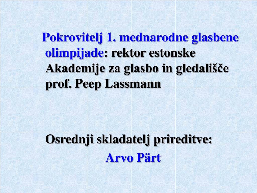 Pokrovitelj 1. mednarodne glasbene olimpijade:rektor estonske Akademije za glasbo in gledališče prof. Peep Lassmann Osrednji skladatelj prireditve: Arvo Pärt