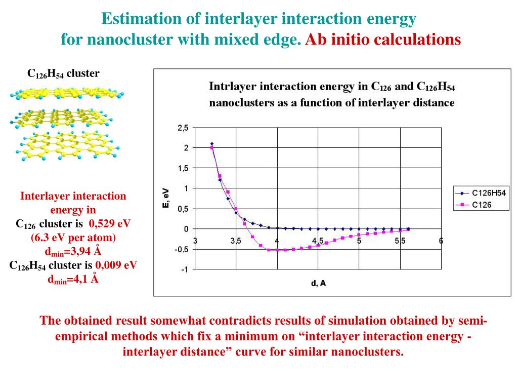 Estimation of interlayer interactionenergy for nanocluster with mixed edge. Ab initio calculations C126H54 cluster Interlayer interaction energy in C126cluster is 0,529 eV (6.3 eV per atom) dmin=3,94 Å C126H54 cluster is 0,009 eV dmin=4,1 Å The obtained result somewhat contradicts results of simulation obtained by semi-empirical methods which fix a minimum on “interlayer interaction energy - interlayer distance” curve for similar nanoclusters.