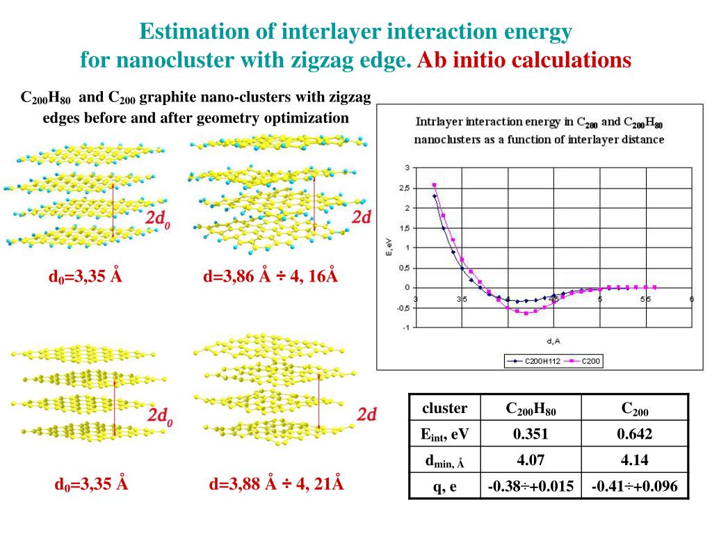 Estimation of interlayer interactionenergyfor nanocluster with zigzag edge. Ab initio calculations С200Н80 and C200 graphite nano-clusters with zigzag edges before and after geometry optimization d0=3,35 Å d=3,86 Å ÷ 4, 16Å d0=3,35 Å d=3,88 Å ÷ 4, 21Å