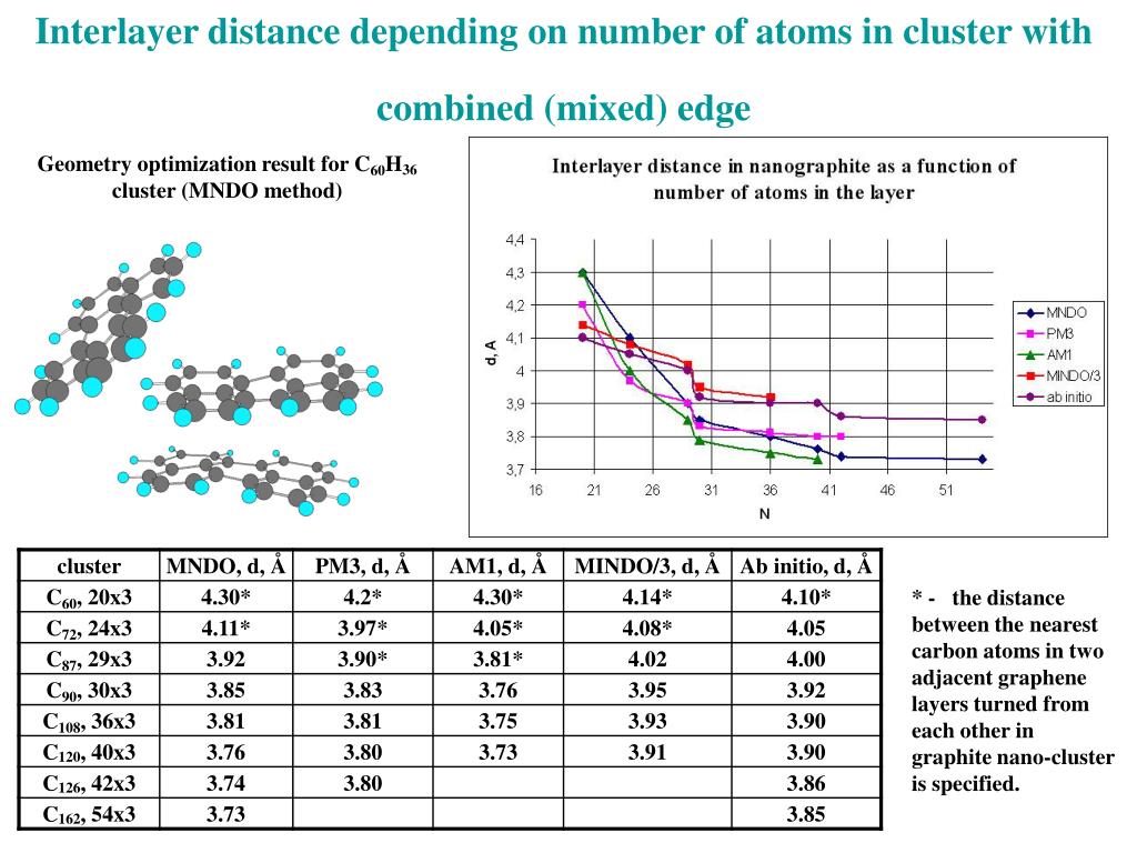 Interlayer distance depending on number of atoms in cluster with combined (mixed) edge Geometry optimization result for C60H36 cluster (MNDO method) * - the distance between the nearest carbon atoms in two adjacent graphene layers turned from each other in graphite nano-cluster is specified.
