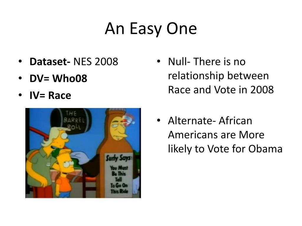 An Easy One • Dataset- NES 2008 • DV= Who08 • IV= Race • Null- There is no relationship between Race and Vote in 2008 • Alternate- African Americans are More likely to Vote for Obama
