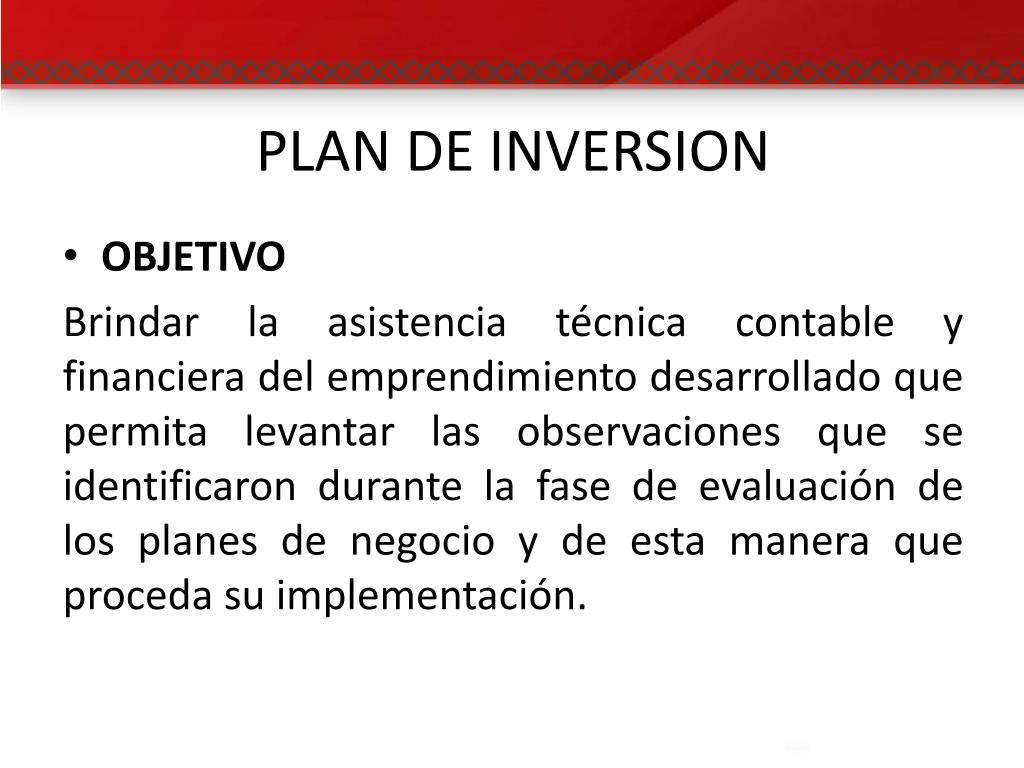 PLAN DE INVERSION • OBJETIVO Brindar la asistencia técnica contable y financiera del emprendimiento desarrollado que permita levantar las observaciones que se identificaron durante la fase de evaluación de los planes de negocio y de esta manera que proceda su implementación.