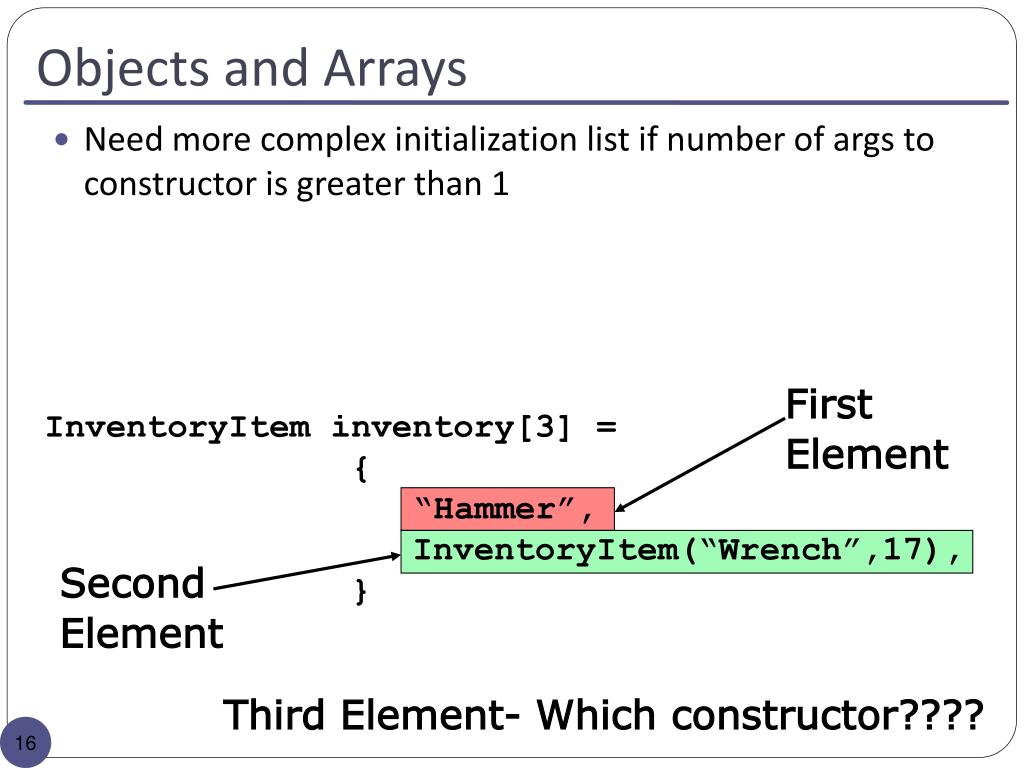 Objects and Arrays First Element InventoryItem inventory[3] = { “Hammer”, InventoryItem(“Wrench”,17), } Second Element Third Element- Which constructor???? Need more complex initialization list if number of args to constructor is greater than 1