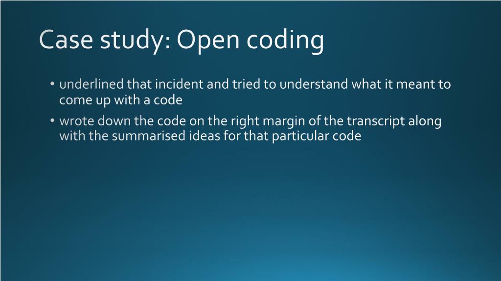 Case study: Open coding • underlined that incident and tried to understand what it meant to come up with a code • wrote down the code on the right margin of the transcript along with the summarised ideas for that particular code