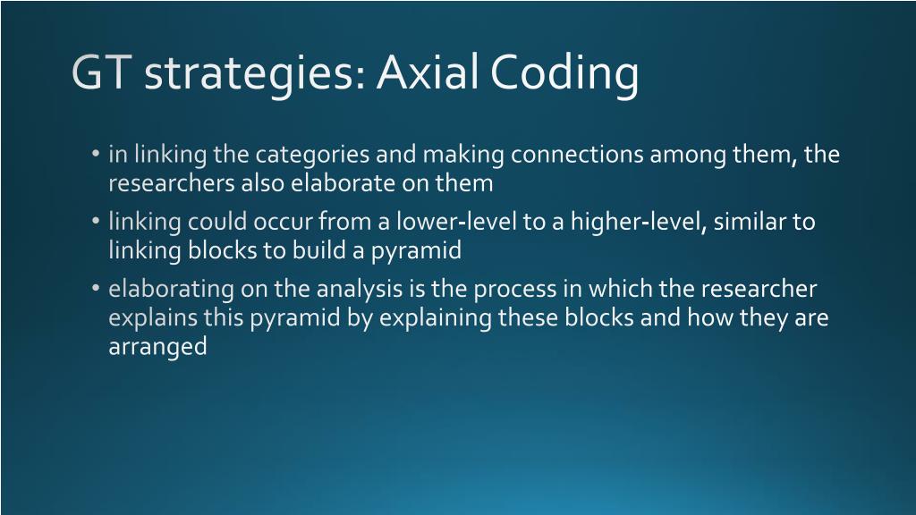 GT strategies: Axial Coding elaborating the analysis • the distinctions made between open coding and axial coding are artificial and for explanatory purposes only • open coding is breaking data apart and delineating concepts to stand for blocks of raw data • axial coding is the act of relating concepts/categories to each other
