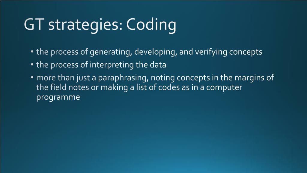 GT strategies: Coding • the process of generating, developing, and verifying concepts • the process of interpreting the data • more than just a paraphrasing, noting concepts in the margins of the field notes or making a list of codes as in a computer programme