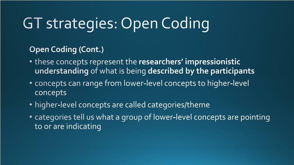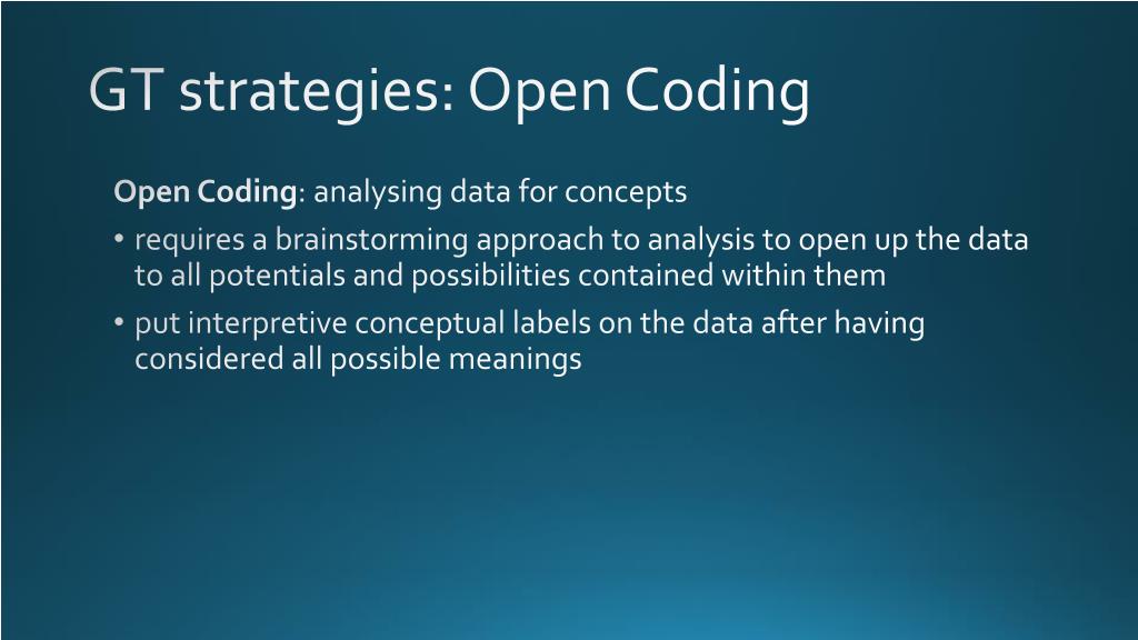 GT strategies: Open Coding Open Coding: analysing data for concepts • requires a brainstorming approach to analysis to open up the data to all potentials and possibilities contained within them • put interpretive conceptual labels on the data after having considered all possible meanings