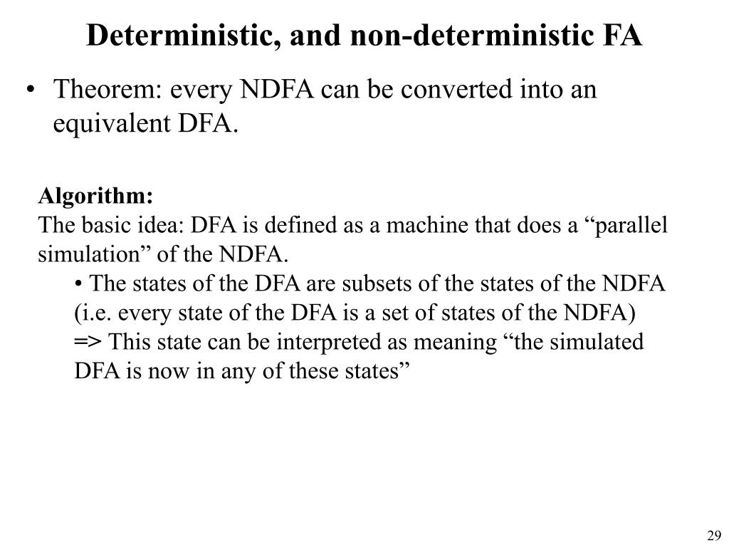 Deterministic, and non-deterministic FA • Theorem: every NDFA can be converted into an equivalent DFA. • Algorithm: • The basic idea: DFA is defined as a machine that does a “parallel simulation” of the NDFA. • The states of the DFA are subsets of the states of the NDFA (i.e. every state of the DFA is a set of states of the NDFA) • => This state can be interpreted as meaning “the simulated DFA is now in any of these states”