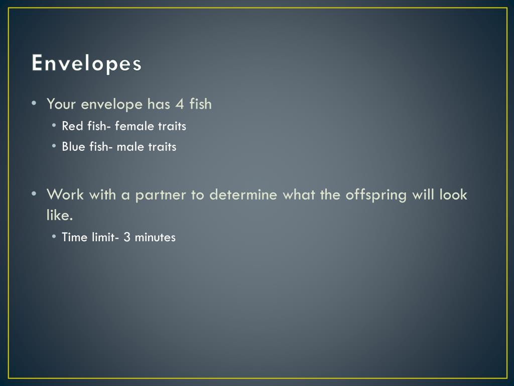 Envelopes • Your envelope has 4 fish • Red fish- female traits • Blue fish- male traits • Work with a partner to determine what the offspring will look like. • Time limit- 3 minutes