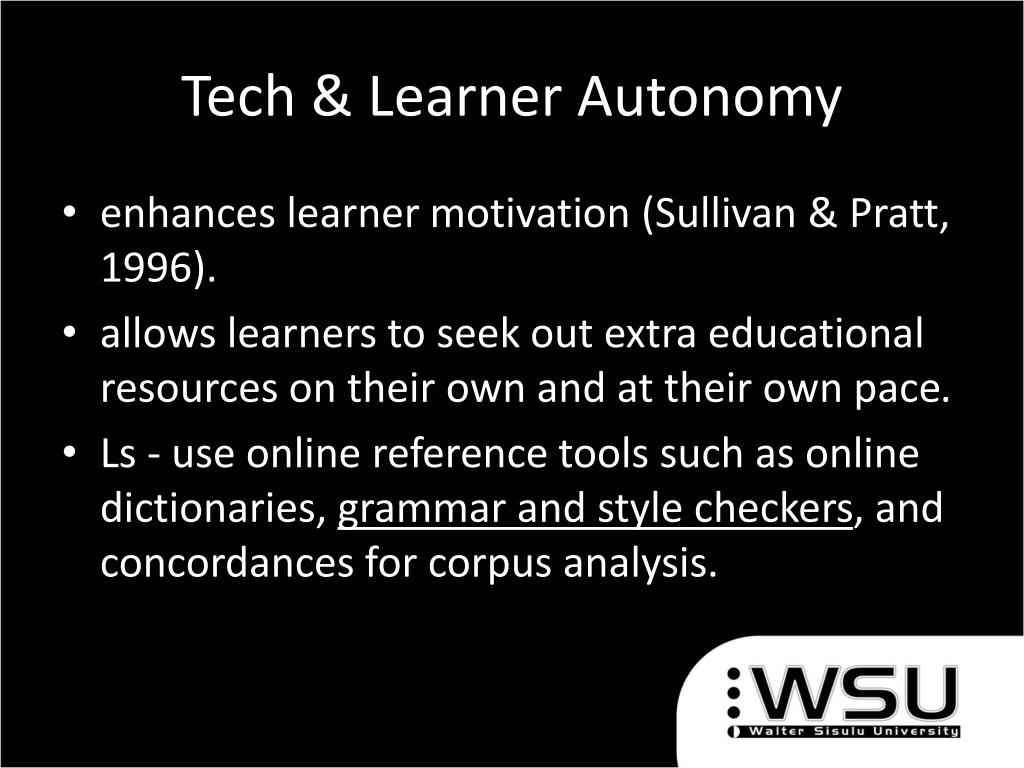 Tech & Learner Autonomy • enhances learner motivation (Sullivan & Pratt, 1996). • allows learners to seek out extra educational resources on their own and at their own pace. • Ls - use online reference tools such as online dictionaries, grammar and style checkers, and concordances for corpus analysis.