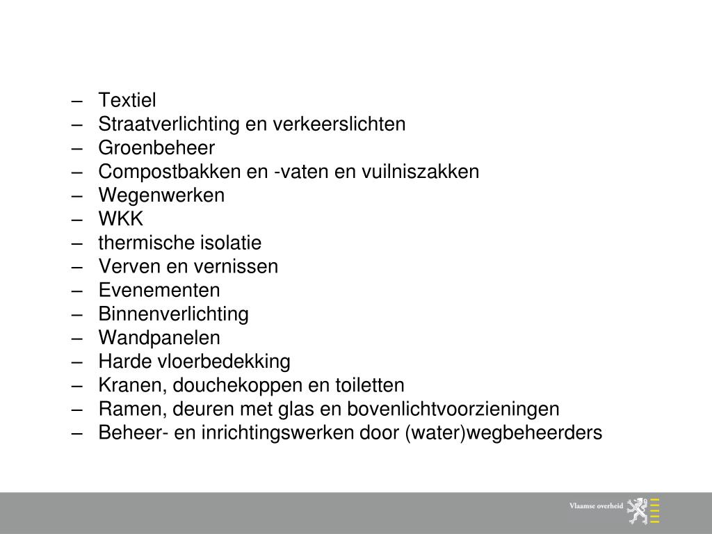 Textiel • Straatverlichting en verkeerslichten • Groenbeheer • Compostbakken en -vaten en vuilniszakken • Wegenwerken • WKK • thermische isolatie • Verven en vernissen • Evenementen • Binnenverlichting • Wandpanelen • Harde vloerbedekking • Kranen, douchekoppen en toiletten • Ramen, deuren met glas en bovenlichtvoorzieningen • Beheer- en inrichtingswerken door (water)wegbeheerders
