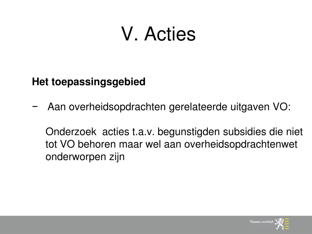 V. Acties • Het toepassingsgebied • Aan overheidsopdrachten gerelateerde uitgaven VO: Onderzoek acties t.a.v. begunstigden subsidies die niet tot VO behoren maar wel aan overheidsopdrachtenwet onderworpen zijn