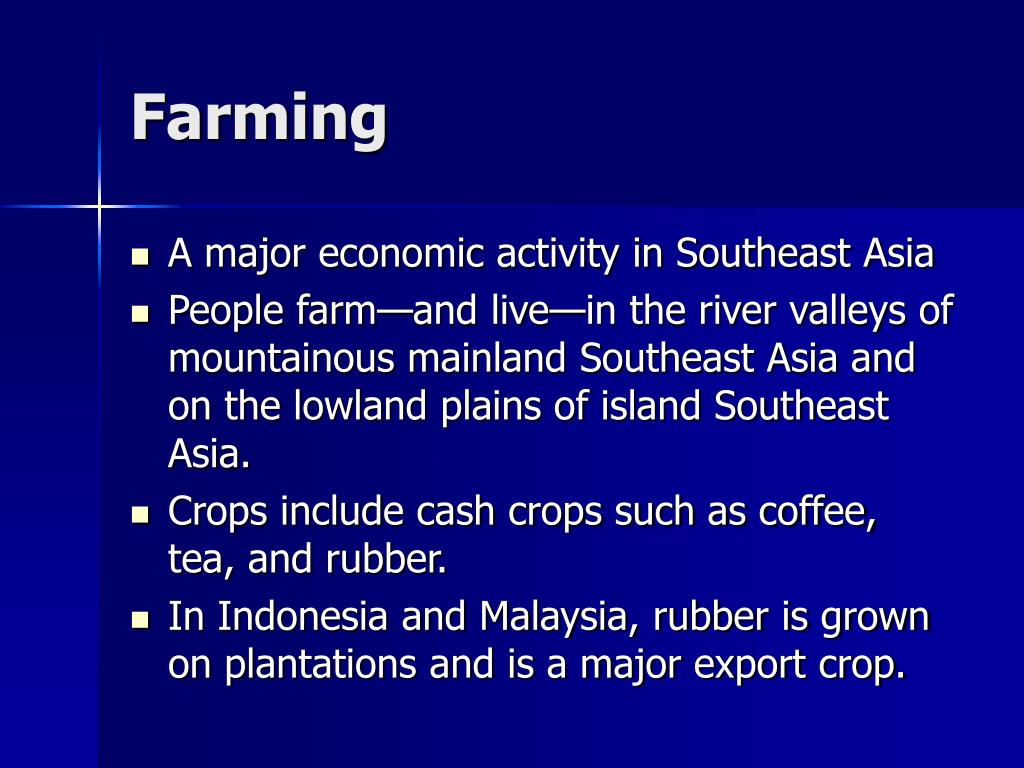 Farming • A major economic activity in Southeast Asia • People farm—and live—in the river valleys of mountainous mainland Southeast Asia and on the lowland plains of island Southeast Asia. • Crops include cash crops such as coffee, tea, and rubber. • In Indonesia and Malaysia, rubber is grown on plantations and is a major export crop.