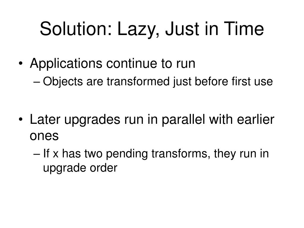 Solution: Lazy, Just in Time • Applications continue to run • Objects are transformed just before first use • Later upgrades run in parallel with earlier ones • If x has two pending transforms, they run in upgrade order