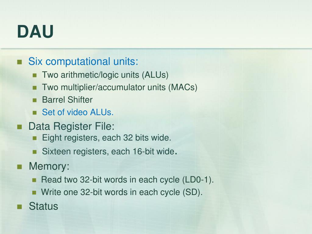 DAU • Six computational units: • Two arithmetic/logicunits (ALUs) • Twomultiplier/accumulatorunits (MACs) • Barrel Shifter • Set of video ALUs. • Data Register File: • Eight registers, each 32 bits wide. • Sixteen registers, each 16-bit wide. • Memory: • Readtwo 32-bit words in eachcycle (LD0-1). • Writeone 32-bit words in eachcycle (SD). • Status