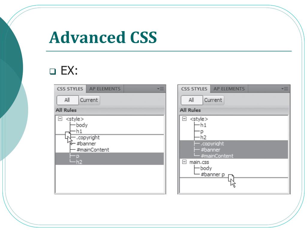 Advanced CSS • Moving and Managing Styles: To move a style from one place to another in the same style sheet: • Drag the style in the CSS Styles panel. The order the styles are listed in the CSS Styles panel represents their order in the actual CSS • You can select and move more than one style at a time by Ctrl-clicking