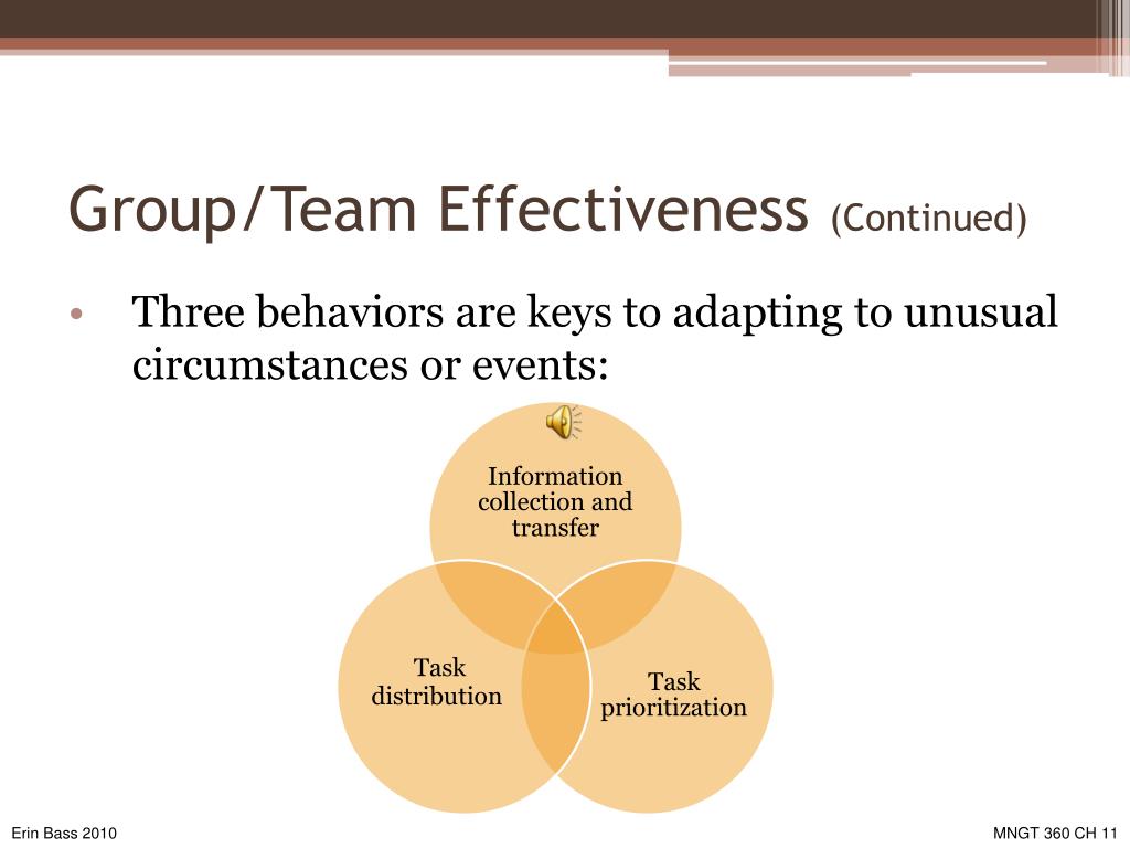 Group/Team Effectiveness (Continued) • Three behaviors are keys to adapting to unusual circumstances or events: