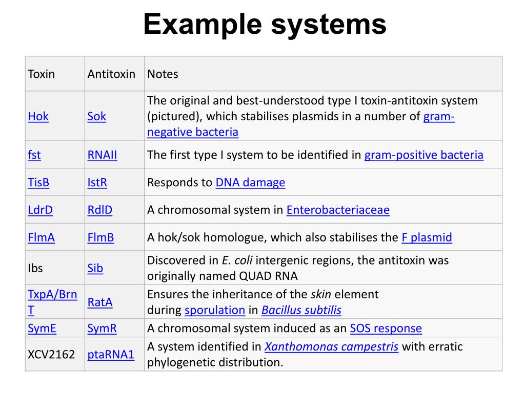 A toxin-antitoxin system is a set of two or more closely linked genes that together encode both a protein 'poison' and a corresponding 'antidote'. • When these systems are contained on plasmids – transferable genetic elements – they ensure that only the daughter cells that inherit the plasmid survive after cell division. • If the plasmid is absent in a daughter cell, the unstable anti-toxin is degraded and the stable toxic protein kills the new cell; this is known as 'post-segregational killing'(PSK).
