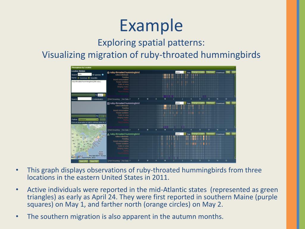 ExampleExploring spatial patterns: Visualizing migration of ruby-throated hummingbirds • This graph displays observations of ruby-throated hummingbirds from three locations in the eastern United States in 2011. • Active individuals were reported in the mid-Atlantic states (represented as green triangles) as early as April 24. They were first reported in southern Maine (purple squares) on May 1, and farther north (orange circles) on May 2. • The southern migration is also apparent in the autumn months.