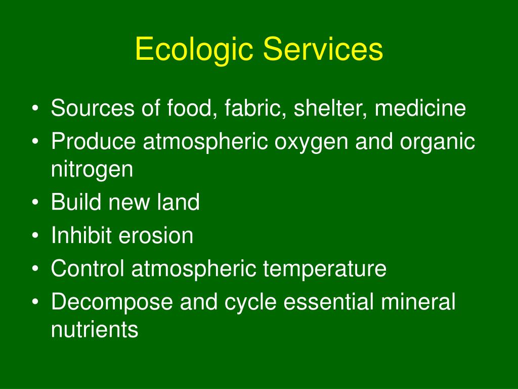 Ecologic Services • Sources of food, fabric, shelter, medicine • Produce atmospheric oxygen and organic nitrogen • Build new land • Inhibit erosion • Control atmospheric temperature • Decompose and cycle essential mineral nutrients