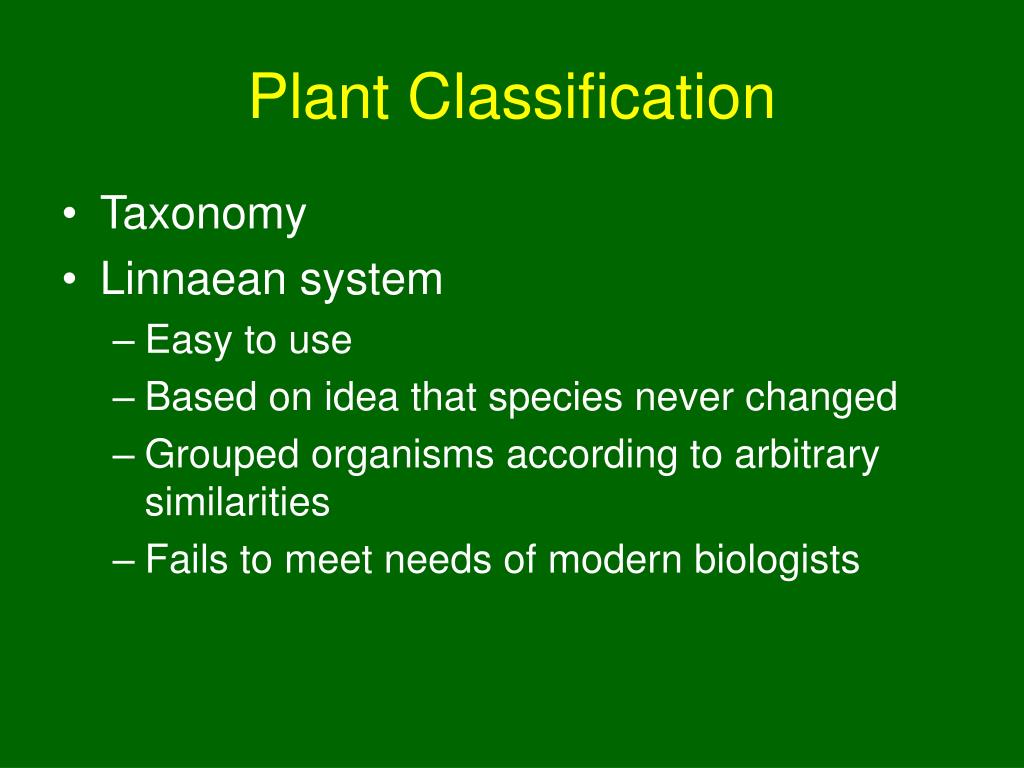 Plant Classification • Taxonomy • Linnaean system • Easy to use • Based on idea that species never changed • Grouped organisms according to arbitrary similarities • Fails to meet needs of modern biologists