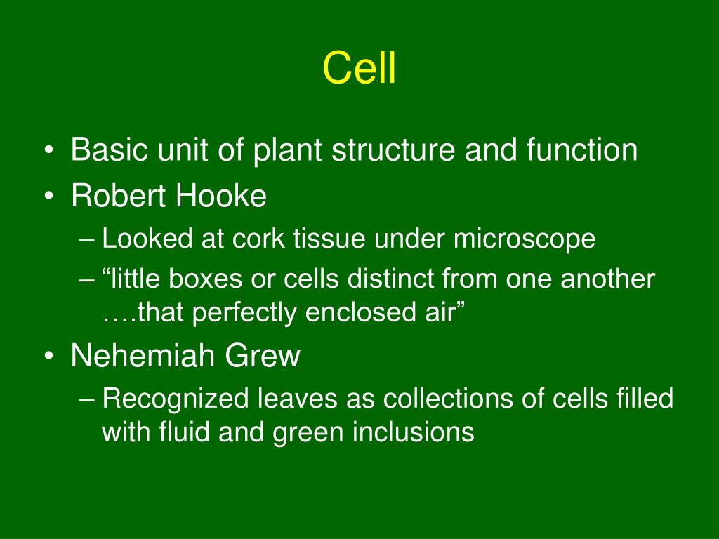 Cell • Basic unit of plant structure and function • Robert Hooke • Looked at cork tissue under microscope • “little boxes or cells distinct from one another ….that perfectly enclosed air” • Nehemiah Grew • Recognized leaves as collections of cells filled with fluid and green inclusions