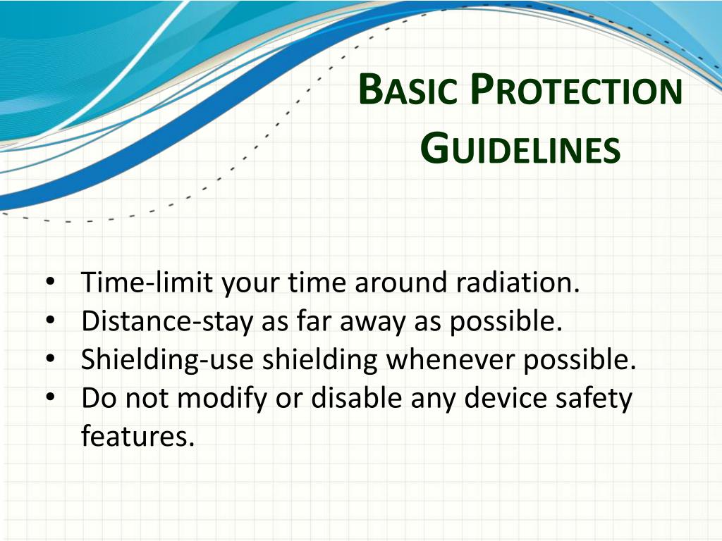 Basic Protection Guidelines • Time-limit your time around radiation. • Distance-stay as far away as possible. • Shielding-use shielding whenever possible. • Do not modify or disable any device safety features.