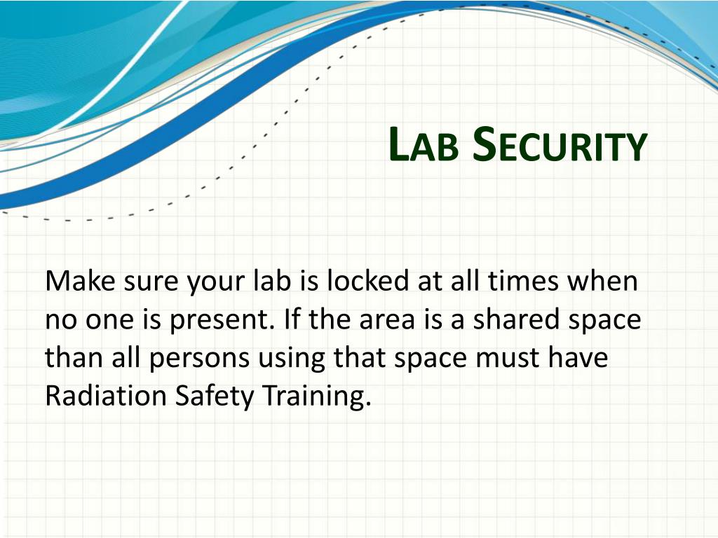 Lab Security Make sure your lab is locked at all times when no one is present. If the area is a shared space than all persons using that space must have Radiation Safety Training.