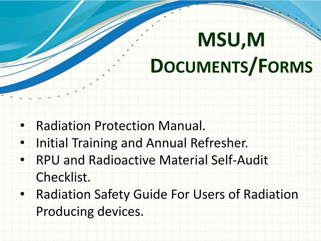 MSU,MDocuments/Forms • Radiation Protection Manual. • Initial Training and Annual Refresher. • RPU and Radioactive Material Self-Audit Checklist. • Radiation Safety Guide For Users of Radiation Producing devices.