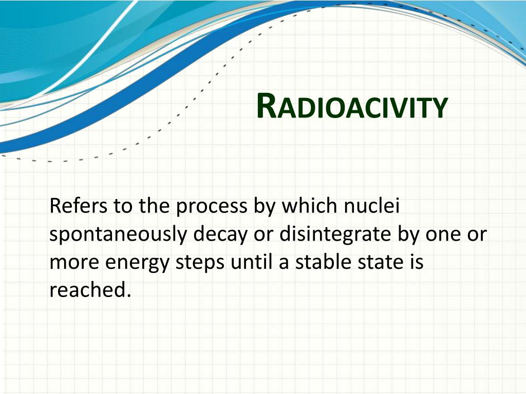 Radioacivity Refers to the process by which nuclei spontaneously decay or disintegrate by one or more energy steps until a stable state is reached.