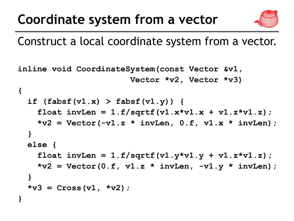 Coordinate system from a vector Construct a local coordinate system from a vector. inline void CoordinateSystem(const Vector &v1, Vector *v2, Vector *v3) { if (fabsf(v1.x) > fabsf(v1.y)) { float invLen = 1.f/sqrtf(v1.x*v1.x + v1.z*v1.z); *v2 = Vector(-v1.z * invLen, 0.f, v1.x * invLen); } else { float invLen = 1.f/sqrtf(v1.y*v1.y + v1.z*v1.z); *v2 = Vector(0.f, v1.z * invLen, -v1.y * invLen); } *v3 = Cross(v1, *v2); }