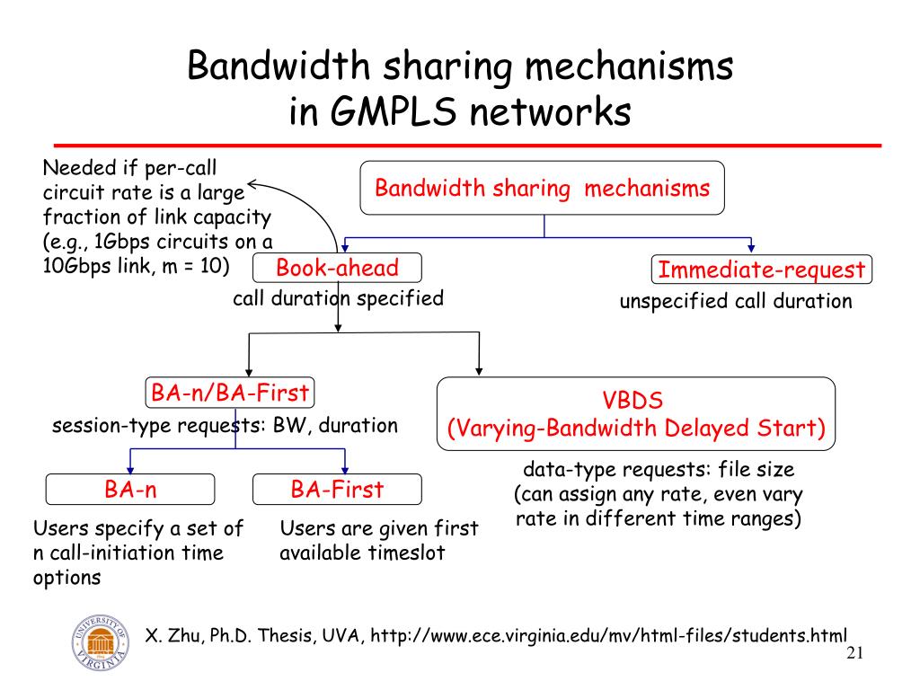 Bandwidth sharing mechanismsin GMPLS networks Needed if per-call circuit rate is a large fraction of link capacity (e.g., 1Gbps circuits on a 10Gbps link, m = 10) Bandwidth sharing mechanisms Book-ahead Immediate-request call duration specified unspecified call duration BA-n/BA-First VBDS (Varying-Bandwidth Delayed Start) session-type requests: BW, duration data-type requests: file size (can assign any rate, even vary rate in different time ranges) BA-n BA-First Users specify a set of n call-initiation time options Users are given first available timeslot X. Zhu, Ph.D. Thesis, UVA, http://www.ece.virginia.edu/mv/html-files/students.html