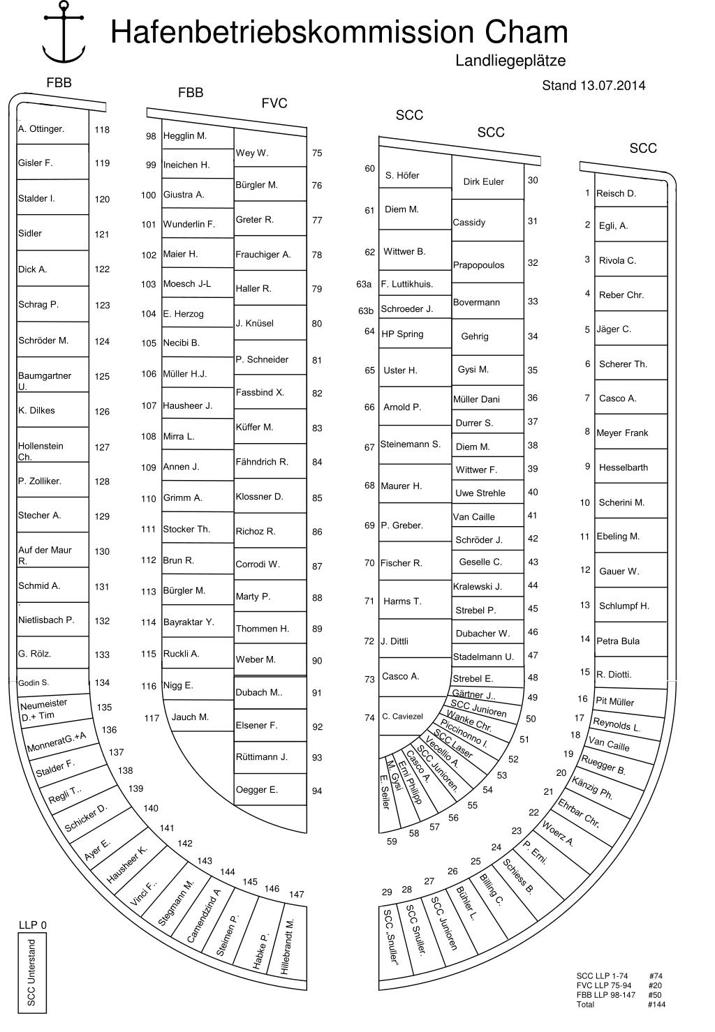 Hafenbetriebskommission Cham Landliegeplätze 118 A. Ottinger. 98 Hegglin M. 75 Wey W. 119 Gisler F. 99 Ineichen H. 60 S. Höfer 30 Dirk Euler 76 Bürgler M. 1 Reisch D. 100 Giustra A. 120 Stalder I. 61 Diem M. 77 Greter R. 31 Cassidy 101 Wunderlin F. 2 Egli, A. 121 Sidler 62 Wittwer B. 78 102 Maier H. Frauchiger A. 3 Rivola C. 32 Prapopoulos 122 Dick A. 63a 103 Moesch J-L F. Luttikhuis. 79 Haller R. 4 Reber Chr. 33 Bovermann 123 Schrag P. Schroeder J. 104 E. Herzog 80 J. Knüsel Jäger C. 5 64 Gehrig 34 124 Schröder M. 105 Necibi B. 81 P. Schneider 6 Scherer Th. 65 Gysi M. 35 Uster H. 106 Müller H.J. 125 Baumgartner U. 82 Fassbind X. 36 7 Casco A. Müller Dani 107 Hausheer J. 66 Arnold P. 126 K. Dilkes 37 Durrer S. 83 Küffer M. 8 Meyer Frank 108 Mirra L. Steinemann S. 38 127 67 Hollenstein Ch. Diem M. 84 Fähndrich R. 109 9 Annen J. Hesselbarth 39 Wittwer F. 128 P. Zolliker. 68 Maurer H. 40 Uwe Strehle Klossner D. 85 110 Grimm A. 10 Scherini M. 129 Stecher A. 41 Van Caille 69 P. Greber. 111 Stocker Th. 86 Richoz R. Ebeling M. 11 42 Schröder J. Auf der Maur R. 130 112 Brun R. 70 Geselle C. 43 Fischer R. Corrodi W. 87 12 Gauer W. 131 44 Schmid A. . Kralewski J. 113 Bürgler M. 88 Marty P. 71 Harms T. 13 Schlumpf H. 45 Strebel P. 132 Nietlisbach P. 114 Bayraktar Y. 89 Thommen H. 46 Dubacher W. 14 72 Petra Bula J. Dittli 115 133 G. Rölz. Ruckli A. 47 Stadelmann U. 90 Weber M. 15 R. Diotti. 48 73 Strebel E. 134 Godin S. 116 Nigg E. 91 Dubach M.. Gärtner J.. 49 16 Pit Müller Neumeister D.+ Tim 135 SCC Junioren 74 117 Jauch M. C. Caviezel 17 50 Wanke Chr. Elsener F. 92 Reynolds L. 136 18 Piccinonno I. 51 MonneratG.+A Van Caille SCC Laser 137 19 93 Rüttimann J. Vecellio A. 52 Stalder F. Ruegger B. 138 SCC Junioren. 20 53 Casco A. 139 Regli T.. 94 Erni Philipp Oegger E. 54 M. Gysi Känzig Ph. 21 E. Seiler 55 140 22 Schicker D. Ehrbar Chr. 56 141 57 23 58 Ayer E. Woerz A. 59 142 24 143 Hausheer K. 25 P. Erni. 144 26 145 27 Vinci F.. Schiess B. 146 28 29 147 Stegmann M. Billing C. Bühler L. Camendzind A SCC Junioren Steimen P. SCC Snuller. Habke P. SCC „Snuller“ Hillebrandt M. FBB Stand 13.07.2014 FBB FVC SCC SCC SCC 63b HP Spring Casco A. LLP 0 SCC Unterstand SCC LLP 1-74 #74 FVC LLP 75-94 #20 FBB LLP 98-147 #50 Total #144