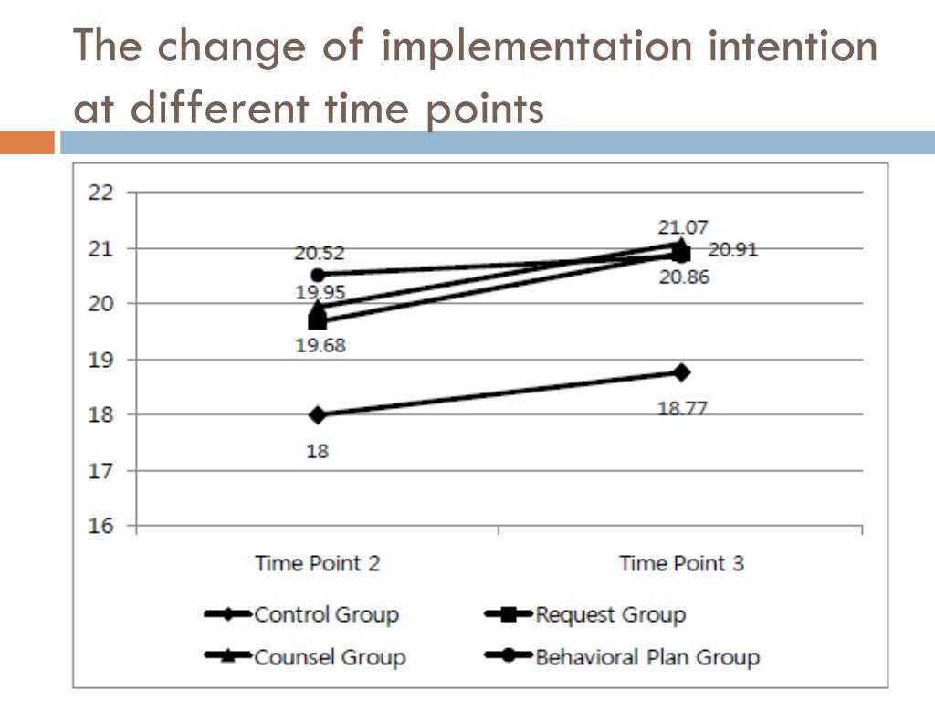 The change of mind after receiving psychological strategy • The control group do not have a big change because there is nothing given to this group. • The experimental groups including request, counsel, and behavioral plan group all display a monotonic increasing. That implies the persuasive communication has a effect on the behavior modification.