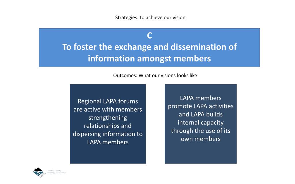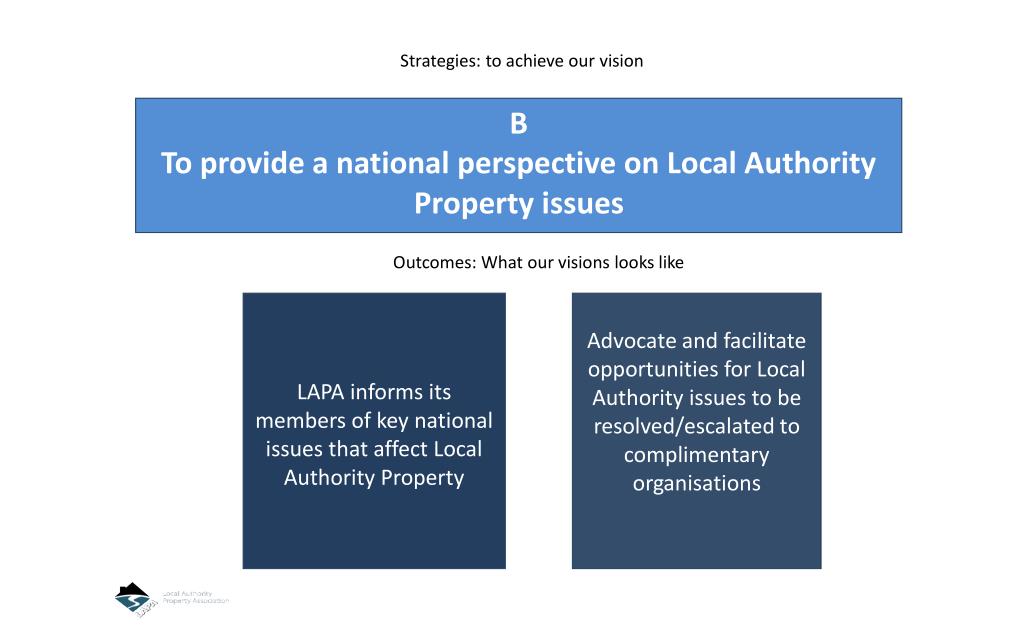 Strategies: to achieve our vision B To provide a national perspective on Local Authority Property issues Outcomes: What our visions looks like LAPA informs its members of key national issues that affect Local Authority Property Advocate and facilitate opportunities for Local Authority issues to be resolved/escalated to complimentary organisations