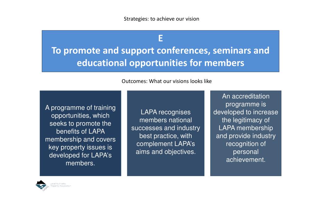 Strategies: to achieve our vision E To promote and support conferences, seminars and educational opportunities for members Outcomes: What our visions looks like A programme of training opportunities, which seeks to promote the benefits of LAPA membership and covers key property issues is developed for LAPA’s members. LAPA recognises members national successes and industry best practice, with complement LAPA’s aims and objectives. An accreditation programme is developed to increase the legitimacy of LAPA membership and provide industry recognition of personal achievement.