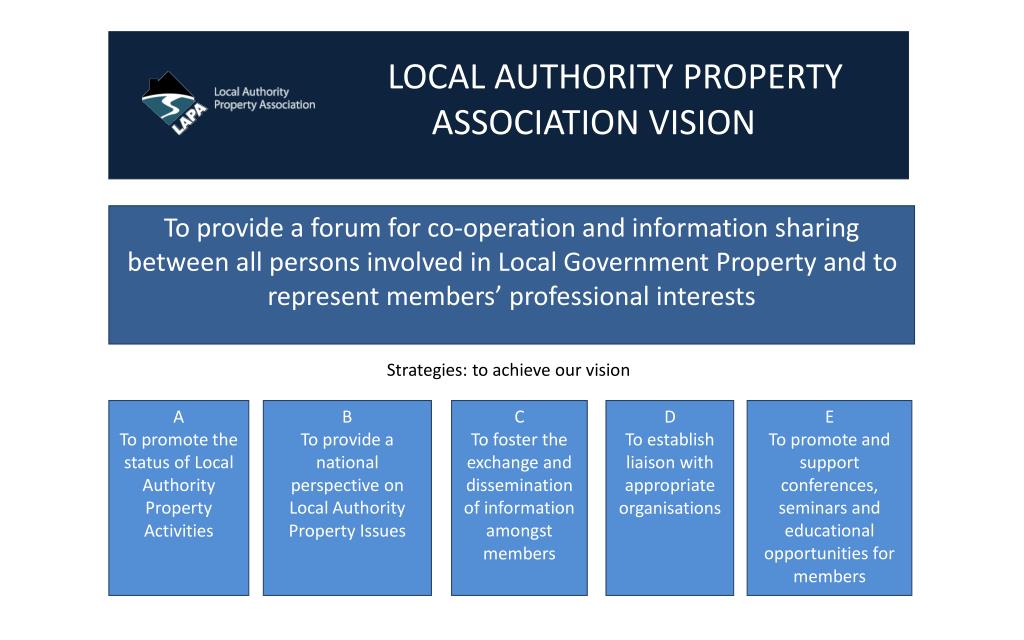 LOCAL AUTHORITY PROPERTY ASSOCIATION VISION To provide a forum for co-operation and information sharing between all persons involved in Local Government Property and to represent members’ professional interests Strategies: to achieve our vision A To promote the status of Local Authority Property Activities B To provide a national perspective on Local Authority Property Issues C To foster the exchange and dissemination of information amongst members D To establish liaison with appropriate organisations E To promote and support conferences, seminars and educational opportunities for members