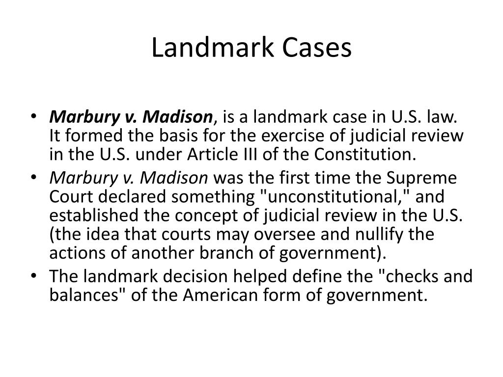 Landmark Cases • Marbury v. Madison, is a landmark case in U.S. law. It formed the basis for the exercise of judicial review in the U.S. under Article III of the Constitution. • Marbury v. Madison was the first time the Supreme Court declared something "unconstitutional," and established the concept of judicial review in the U.S. (the idea that courts may oversee and nullify the actions of another branch of government). • The landmark decision helped define the "checks and balances" of the American form of government.