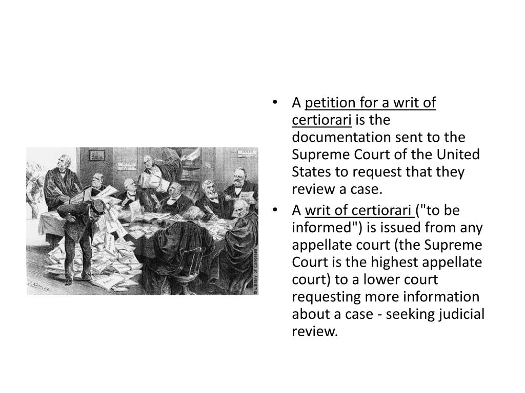 A petition for a writ of certiorari is the documentation sent to the Supreme Court of the United States to request that they review a case. • A writ of certiorari ("to be informed") is issued from any appellate court (the Supreme Court is the highest appellate court) to a lower court requesting more information about a case - seeking judicial review.