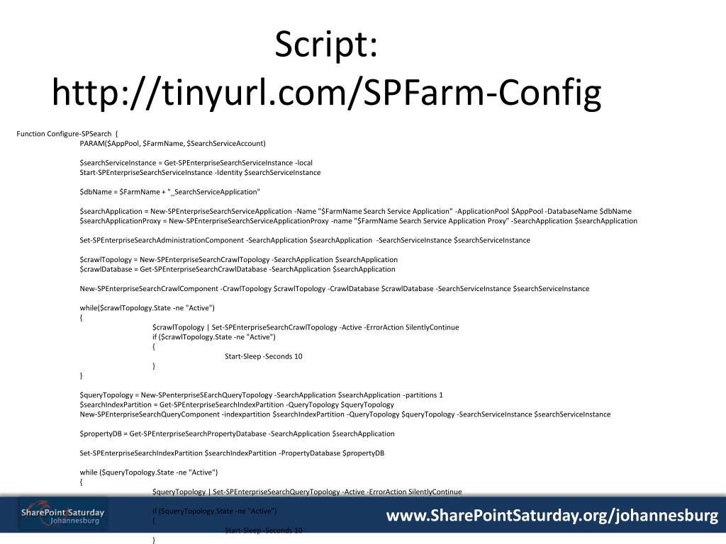 Script: http://tinyurl.com/SPFarm-Config Function Configure-SPSearch { PARAM($AppPool, $FarmName, $SearchServiceAccount) $searchServiceInstance = Get-SPEnterpriseSearchServiceInstance -local Start-SPEnterpriseSearchServiceInstance -Identity $searchServiceInstance $dbName = $FarmName + "_SearchServiceApplication" $searchApplication = New-SPEnterpriseSearchServiceApplication -Name "$FarmName Search Service Application" -ApplicationPool $AppPool -DatabaseName $dbName $searchApplicationProxy = New-SPEnterpriseSearchServiceApplicationProxy -name "$FarmName Search Service Application Proxy" -SearchApplication $searchApplication Set-SPEnterpriseSearchAdministrationComponent -SearchApplication $searchApplication -SearchServiceInstance $searchServiceInstance $crawlTopology = New-SPEnterpriseSearchCrawlTopology -SearchApplication $searchApplication $crawlDatabase = Get-SPEnterpriseSearchCrawlDatabase -SearchApplication $searchApplication New-SPEnterpriseSearchCrawlComponent -CrawlTopology $crawlTopology -CrawlDatabase $crawlDatabase -SearchServiceInstance $searchServiceInstance while($crawlTopology.State -ne "Active") { $crawlTopology | Set-SPEnterpriseSearchCrawlTopology -Active -ErrorActionSilentlyContinue if ($crawlTopology.State -ne "Active") { Start-Sleep -Seconds 10 } } $queryTopology = New-SPenterpriseSEarchQueryTopology -SearchApplication $searchApplication -partitions 1 $searchIndexPartition = Get-SPEnterpriseSearchIndexPartition -QueryTopology $queryTopology New-SPEnterpriseSearchQueryComponent -indexpartition $searchIndexPartition -QueryTopology $queryTopology -SearchServiceInstance $searchServiceInstance $propertyDB = Get-SPEnterpriseSearchPropertyDatabase -SearchApplication $searchApplication Set-SPEnterpriseSearchIndexPartition $searchIndexPartition -PropertyDatabase $propertyDB while ($queryTopology.State -ne "Active") { $queryTopology | Set-SPEnterpriseSearchQueryTopology -Active -ErrorActionSilentlyContinue if ($queryTopology.State -ne "Active") { Start-Sleep -Seconds 10 } } }
