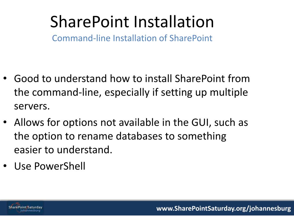 SharePoint InstallationCommand-line Installation of SharePoint Good to understand how to install SharePoint from the command-line, especially if setting up multiple servers. Allows for options not available in the GUI, such as the option to rename databases to something easier to understand. Use PowerShell