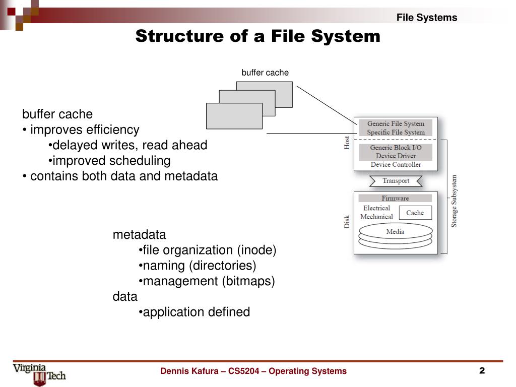 File Systems. Structure of a File System. buffer cache. buffer cache improves efficiency delayed writes, read ahead improved scheduling contains both data and metadata. metadata file organization ( inode ) naming (directories) management (bitmaps) data application defined.