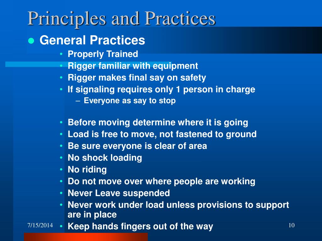 Principles and Practices • General Practices • Properly Trained • Rigger familiar with equipment • Rigger makes final say on safety • If signaling requires only 1 person in charge • Everyone as say to stop • Before moving determine where it is going • Load is free to move, not fastened to ground • Be sure everyone is clear of area • No shock loading • No riding • Do not move over where people are working • Never Leave suspended • Never work under load unless provisions to support are in place • Keep hands fingers out of the way