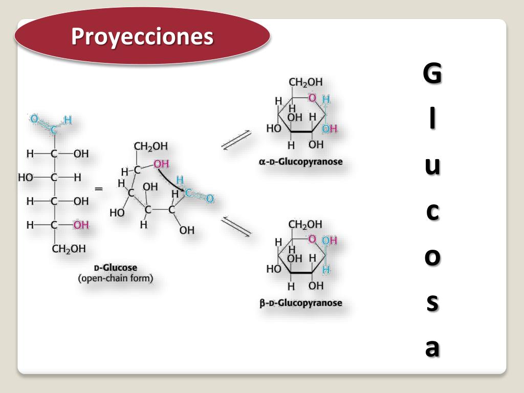 Proyecciones • Nomenclatura D y L • D : el grupo funcional está hacia la derecha • L : el grupo funcional está hacia la izquierda. De Fischer D- Glucosa L- Glucosa
