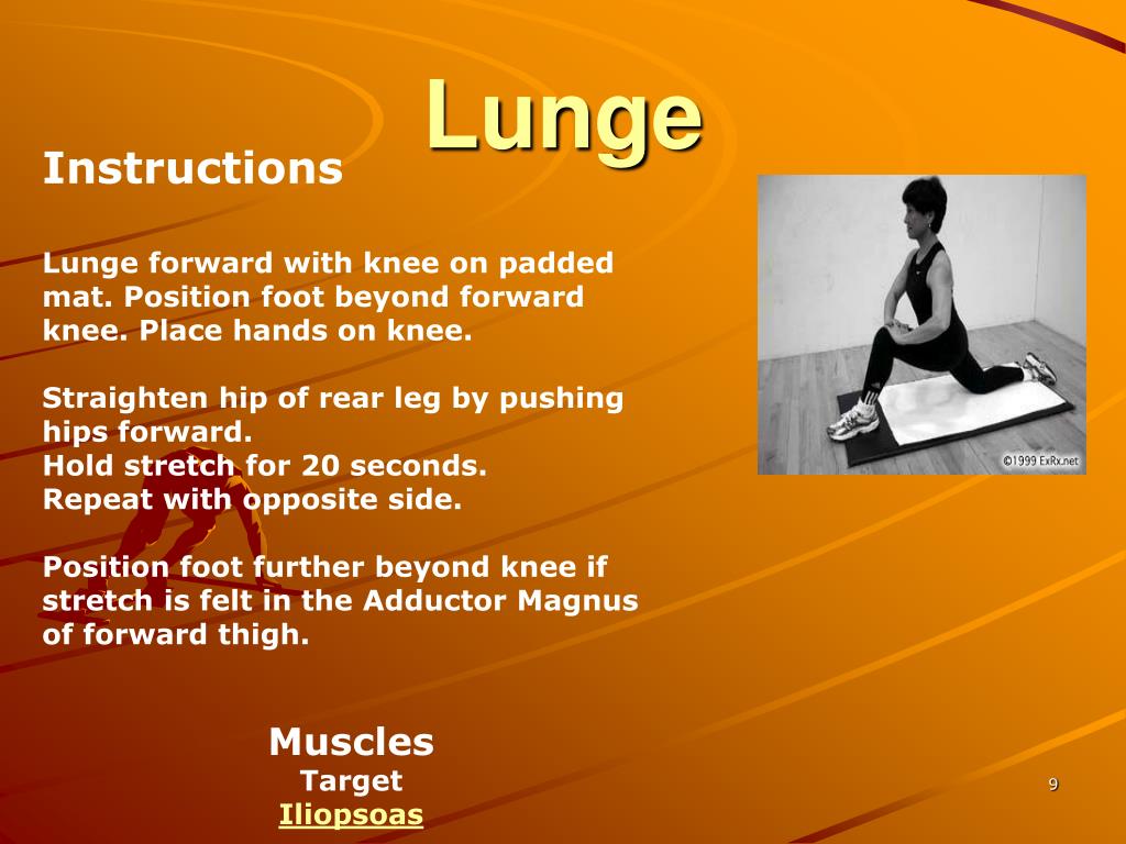Lunge Instructions Lunge forward with knee on padded mat. Position foot beyond forward knee. Place hands on knee. Straighten hip of rear leg by pushing hips forward. Hold stretch for 20 seconds. Repeat with opposite side. Position foot further beyond knee if stretch is felt in the Adductor Magnus of forward thigh. Muscles Target Iliopsoas
