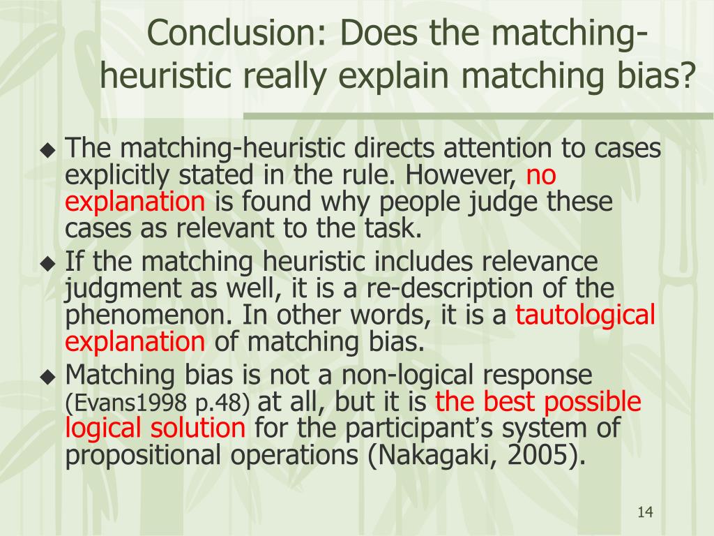 Conclusion: Doesthe matching-heuristicreally explain matching bias? • The matching-heuristic directs attention to cases explicitly stated in the rule. However, no explanation is found why people judge these cases as relevant to the task. • If the matching heuristic includes relevance judgment as well, it is a re-description of the phenomenon. In other words, it is a tautological explanation of matching bias. • Matching bias is not a non-logical response (Evans1998 p.48) at all, but it is the best possible logical solution for the participant’s system of propositional operations (Nakagaki, 2005).