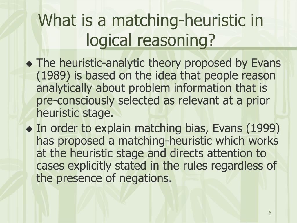 What isa matching-heuristic in logical reasoning? • The heuristic-analytic theory proposed by Evans (1989) is based on the ideathat people reason analytically about problem information that ispre-consciously selectedas relevant at a prior heuristic stage. • In order to explain matching bias, Evans (1999) has proposed a matching-heuristic which works at the heuristic stage and directs attention to cases explicitly stated in the rules regardless of the presence of negations.